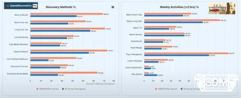 Webfishing domina com 69% de descobertas por boca a boca. O uso de vídeos curtos para descoberta varia muito entre títulos, e há diferenças na relevância de plataformas como Steam, sites de mídia, Discord e outras vias.